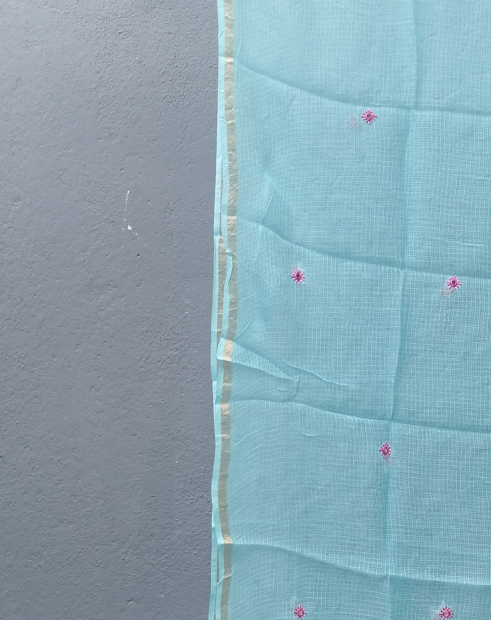 Sky blue Dupatta white embroiderey in floral design and mirror work and golden boreder on either sides are highlights of this kota dupatta